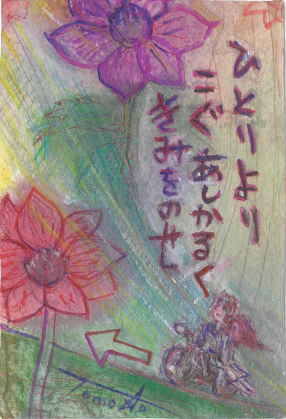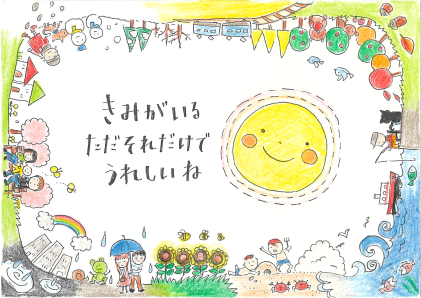 読みやすい文字と見やすくて無駄のない構図。花びらにはグラデーションまでつけています。これが5歳の作品なんてびっくりです。自分より小さな存在を守ろうとする、誰の中にもあるはずの「愛」が素直に描かれていて、胸がじんとしました。(くさか)