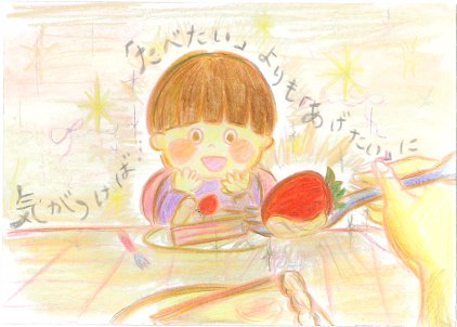 イラスト・詩・レイアウトなど全てが心地よく、思いがまっすぐに伝わる作品だと思いました。パアッとうれしそうな笑顔のまわりがキラキラと光っているのですが、スプーンの上のいちごがそれ以上にピカーっと輝いていて「あげたい愛」の尊さがまぶしいです。(雨宮)