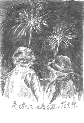黒一色であるが故に花火やいろんな色を想像する楽しみがありますね。睦まじい背中を見つめるのは娘息子なのか孫なのか、その目線から「愛」や「尊敬」を感じます。鉛筆の線の柔らかさも主題にピッタリ。何より、花火を抜き描きにした丁寧さには驚くばかりです。(くさか)