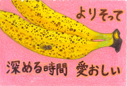 くっついた2本のバナナを「よりそうふたり」と見立てたところ、そして時間の経過をスイートスポットの中に見出して「深める時間」と表現した点が新鮮でした。あたたかい色調にしっかり熟した愛情を感じました。(雨宮)