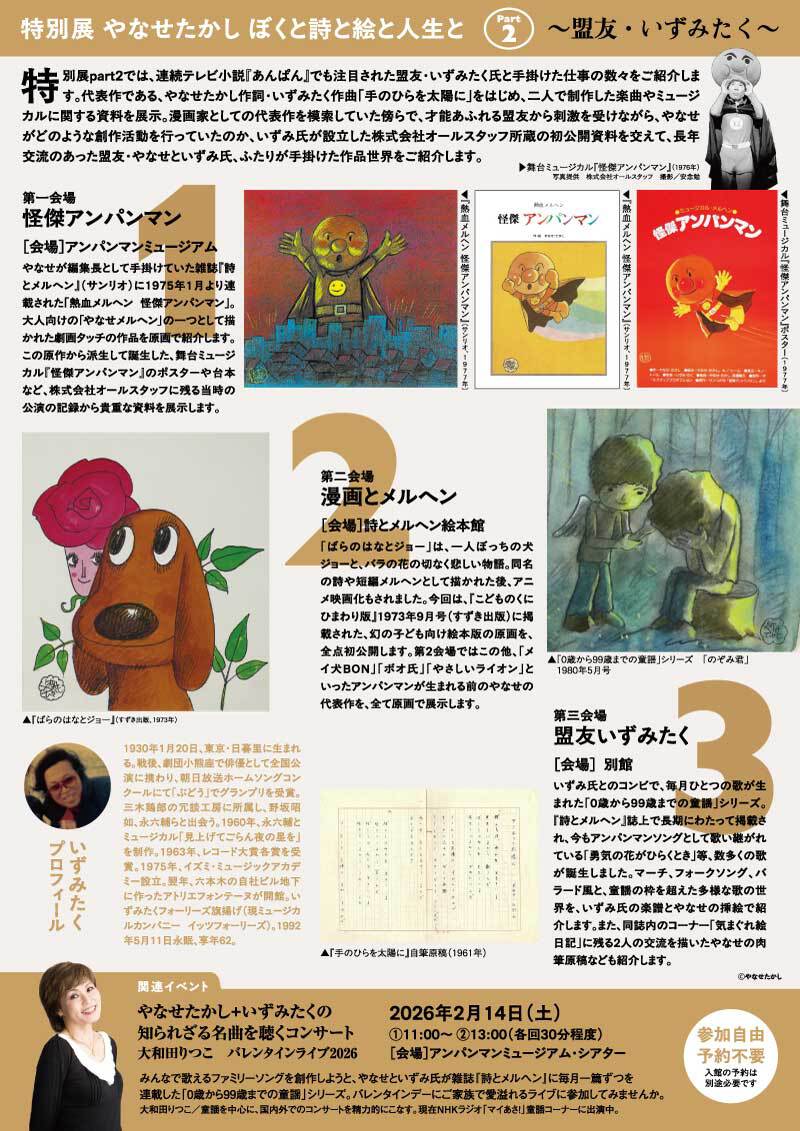 特別展 Part2 では、連続テレビ小説『あんぱん』でも注目された盟友・いずみたく氏と手掛けた仕事の数々をご紹介します。